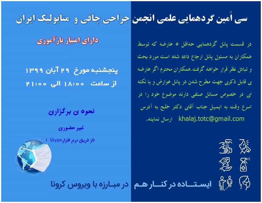in the panel meeting, At least 5 complications that have been referred by the colleagues to the panel manager will be discussed. Respected colleagues, if you have a complication that can be mentioned in the complications panel or a point of view, send it as soon as possible to the email address of Mr. Dr. Khalaj at این آدرس ایمیل توسط spambots حفاظت می شود. برای دیدن شما نیاز به جاوا اسکریپت دارید.