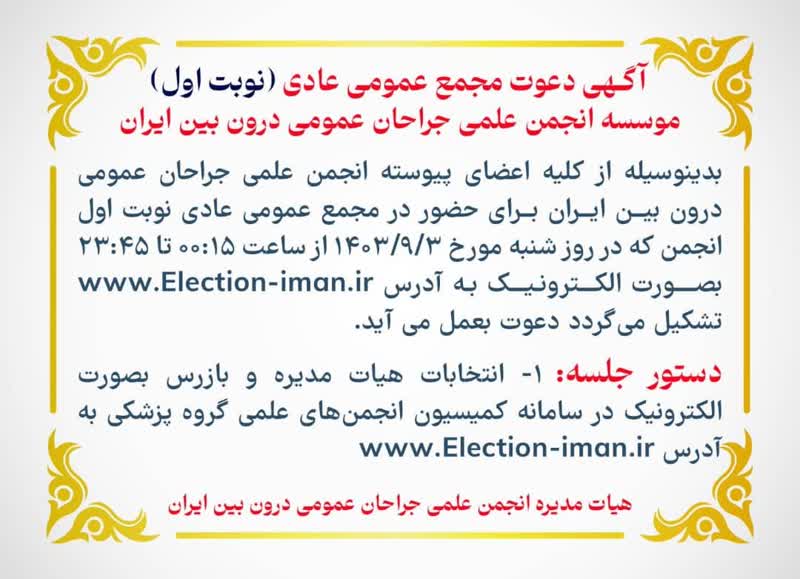 با سلام اعضای محترم انجمن علمی جراحان عمومی درون بین که در سامانه انتخابات ثبت نام کرده اند از ساعت ۰۰:۱۵ میتوانند در انتخابات شرکت کنند.